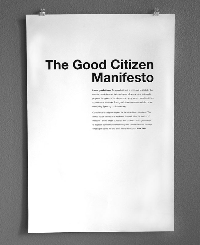 I am a good citizen. As a good citizen it is important to abide by the creative restrictions set forth and never allow my voice to impede progress. I support the decisions made by my superiors and trust them to protect me from risks. For a good citizen, constraint and silence are comforting. Speaking out is unsettling.