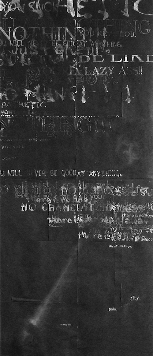 This piece was created during a drawing class. I printed the words on a laser printer then cut and layered each page. I went back over the type with charcoal to push some of the letters and words back in space. I used conté crayon to draw the ghost figure and lamp's light.