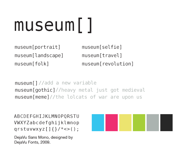 The use of an open source, monospaced font for the logotype is in line with the museum identity. This font is intended for computer programmers who construct the back-end framework that drives creation in the digital environment. Ultimately, the museum provides a clear framework for users to build upon. The primary color palette for the brand is black and white. The secondary palette is influenced by code editors. These colors help organize hundreds of lines of code. This palette also offers an exuberance typically not associated with backend development.