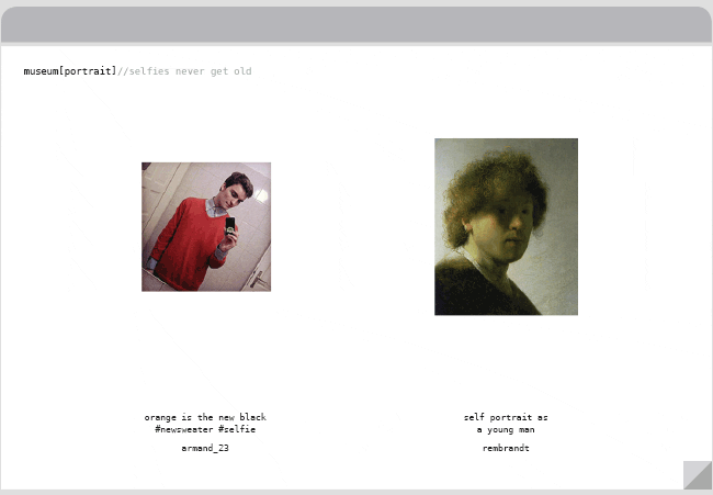 Within this identity system, viewers edit the variable inside of the brackets to have the museum instantly assemble image collections based on their interests. In code, comments can be used to make notes or provide instructions. At times, the museum comments will provide instruction but can also be altered by users to provide feedback or share clever remarks.
