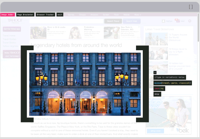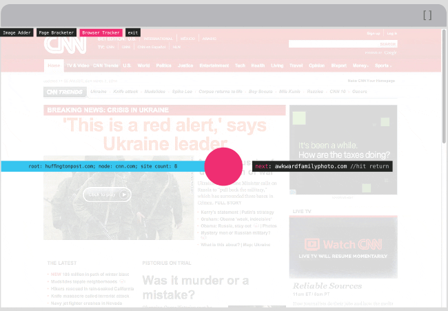 Browser Tracker is an interactive component of the extension that allows the viewer to create a site-by-site recording of her daily online experience. This information can be analyzed for trends or appreciated as threads of the larger web.