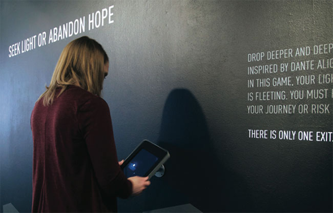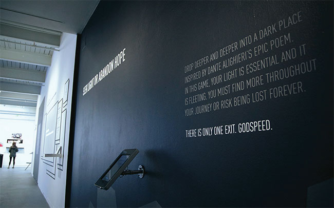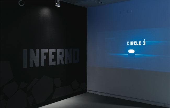 The Inferno mobile game was exhibited at the Maryland Institute College of Art from March 27 to April 12, 2015. My area was the large nook located in the Decker Gallery inside the Fox Building. The exhibition design featured a kiosk to play the game, a demo video projected onto the wall, and vinyl rocks of all shapes and sizes. The walls were painted black and the lighting was filtered to mimic the atmosphere of the game. It was great to see kids cheer as they watched the demo and to get feedback from those who played the game.