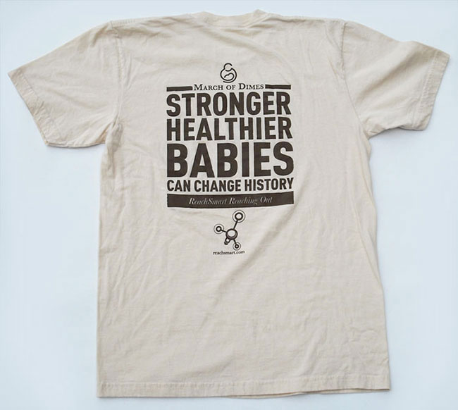 Each year, ReachSmart Interactive participated in the March for Babies, an event supporting the March of Dimes. This concept was developed during a team brainstorming session for the event’s t-shirt design competition. In Photoshop, I combined and altered several photos to create the historical babies featured on the front. I distressed the final image and typogrpahy to mimic an aged illustration or photograph.