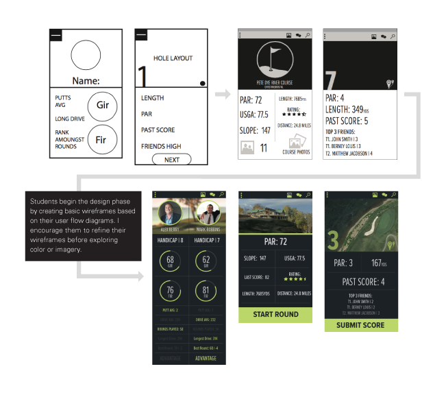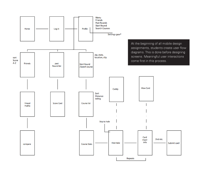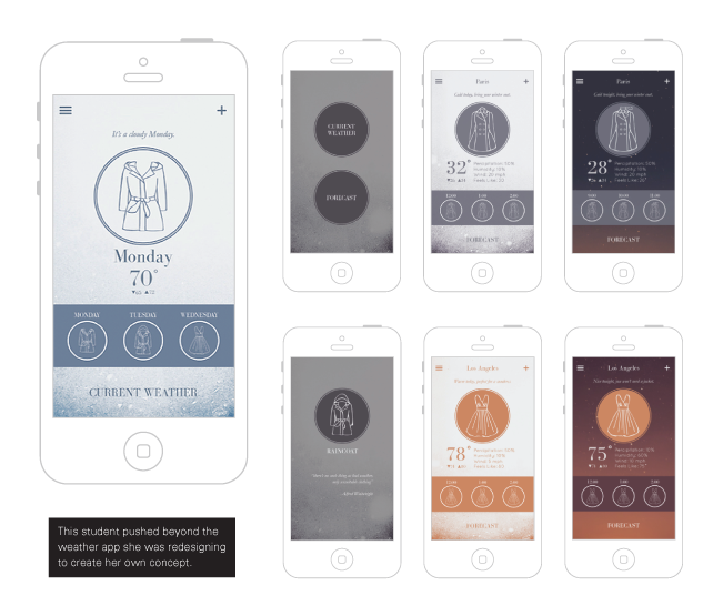 Students were asked to find an existing app or mobile site that was broken, functionally inept, haphazardly planned, and/or poorly designed. Next, their task was to dissect the current user experience and propose changes. Then, students created user stories, user flows, and wireframes to diagnose and improve UX issues within their concepts. Using InVision, they created functional prototypes with their wireframes and final screen designs. Lastly, each student pitched their prototype in class.